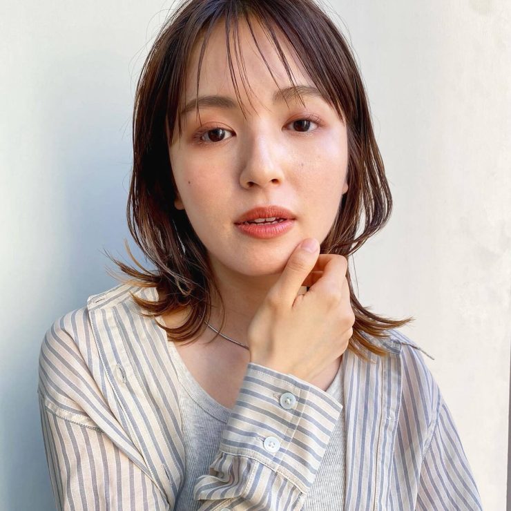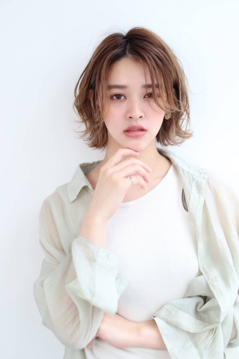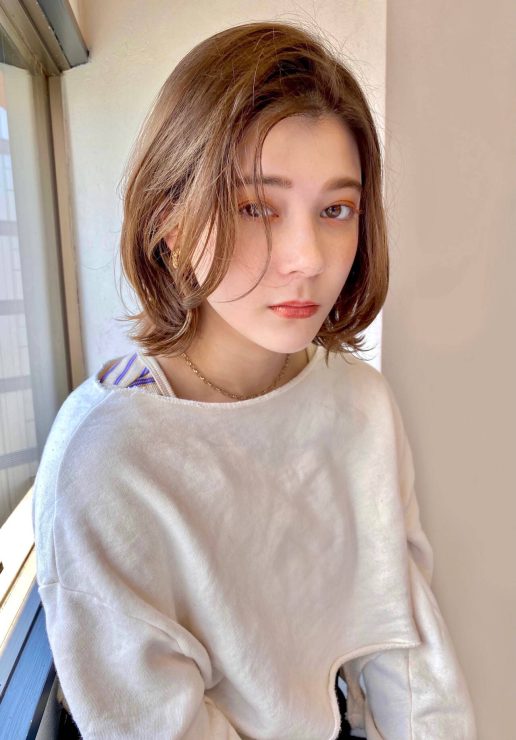くびれボブの重さを感じさせない、軽やかなシースルーバング。おでこが透けて見えることで表情が明るく見え、守りたくなるようなピュアな可愛らしさをプラスできます。