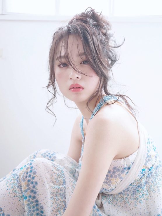 前髪をサイドに編み込んだり、束感を出してカールさせたりするスタイルは、甘めなファッションとの相性バッチリ。中途半端な長さを逆手に取った、あどけなさが可愛いアレンジです。