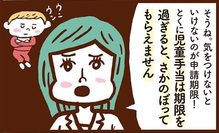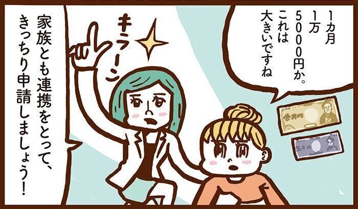 申請が1ヶ月遅れて、1ヶ月分もらい損ねました。何かとお金のかかる時期に、もらえるはずの1万5000円をもらえなかったのは大失敗。