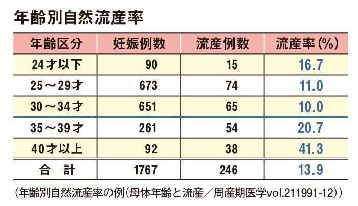 35歳以上になると一挙に流産の確率が跳ね上がり、40代以降の妊娠では41%が流産するというデータも。