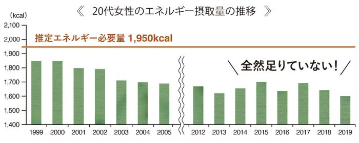20代女性に必要なエネルギー量は1日2,000kcal(※)なのに対して、実際の平均値はそれよりはるかに低い値で推移。エネルギーだけでなく、タンパク質や葉酸、カルシウム、鉄分、亜鉛、ビタミンDなど、大切な栄養素も不足していることが調査でわかっています。