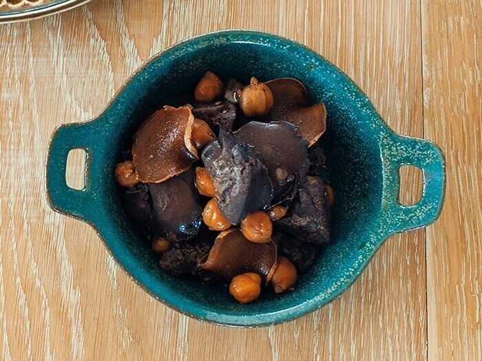 (3)直径20cm鍋に(2)とA、しょうが、レバー、ひよこ豆を入れ、全体をかき混ぜながら強火にかけてひと煮立ちさせ、アクを取る。落としぶたをして強めの中火で約10分、汁けが少なくなるまで煮る。
